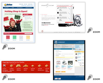 Action Envelope Newsletter, Ivanka Trump e-commerce site, Pepperidge Farm timeline graphic, Steiner Sports checkout.